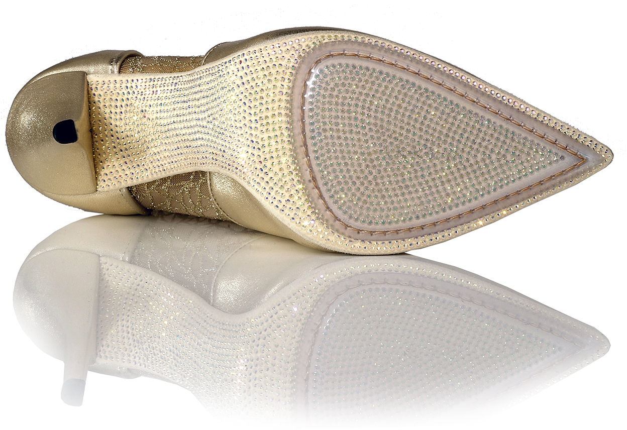Shown in Platino Lame and Gold River Mesh with unique Crystal Sole