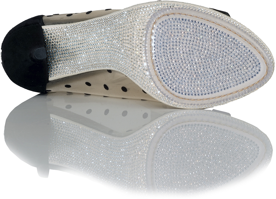 Shown in Black Suede, Nude with Black Polka Dot "Bon Bon" Mesh with unique Crystal Sole