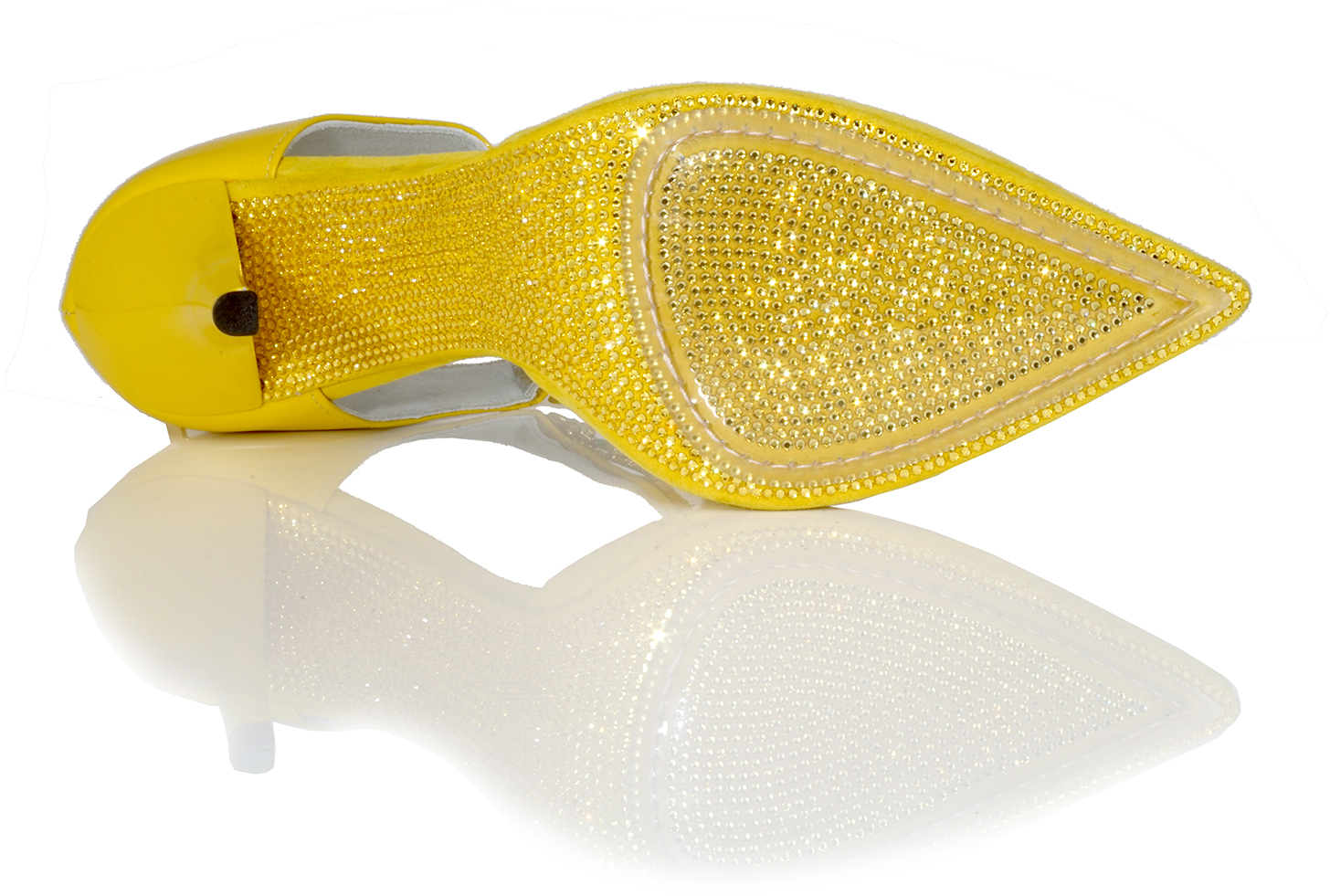 Shown in Yellow with Orange, Blue, Green and Yellow Enamel Flowers T-Strap with unique Yellow Crystal Sole