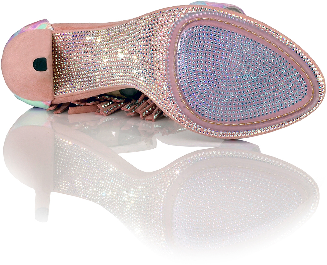 Shown in Picasso Vernice Tremonto Patent (Pink Pastels), Pink Suede Heel and Iridescent Crystal Fringe with unique Iridescent Crystal Sole